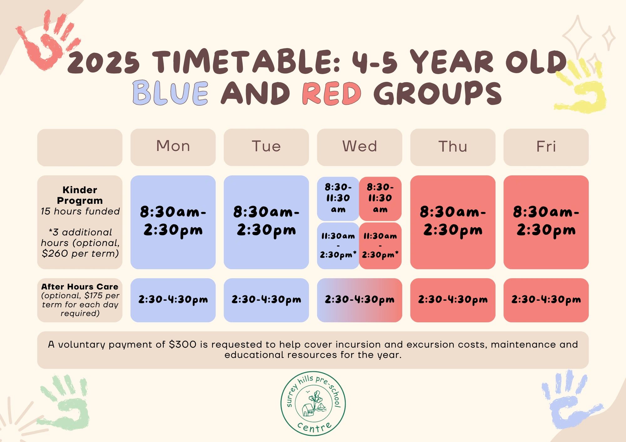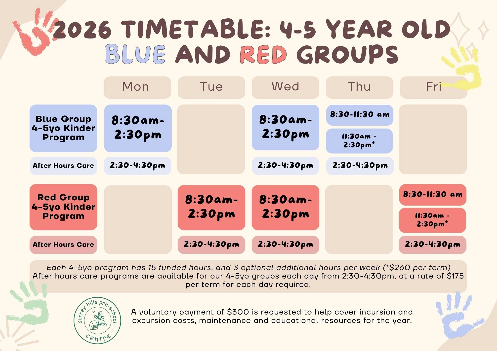 Children enrolled in the 4–5-year-old Blue and Red groups may access hours beyond the 15 government-funded hours per week. These options are offered as follows for 2026: